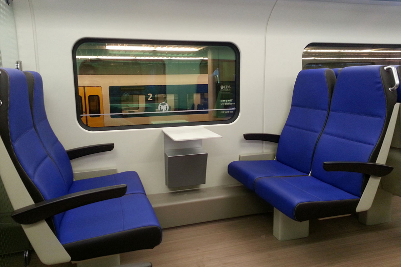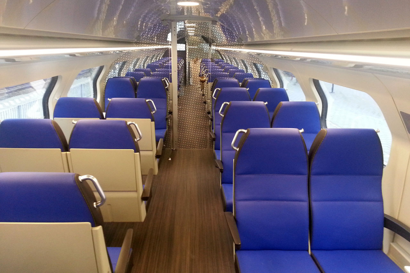 26. Interieur, 1e klas klapzitting, van de Nieuwe Intercity Dubbeldekker (NID), met indelingen in zones.