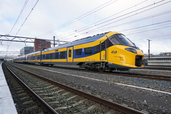 8. Leiden, 4 maart 2023. ICNG 3110 pauzeert even tijdens een proefrit.
