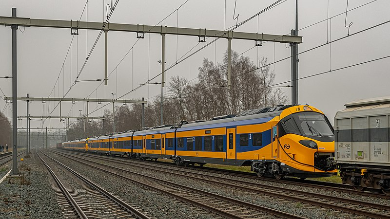 4. Achter RXP 9902 met een aantal containerwagens, tussen twee RADVE koppelwagens, stonden de nieuwe ICNG-stellen 3106 en 3112 aan de kant in Oldenzaal. Doordat er tussen Hengelo en Almelo een aanrijding had plaatsgevonden, was er een stremming op het traject, onderweg naar Watergraafsmeer. Datering: 2 januari 2021. Foto: Rob Dammers - commons.wikimedia.org