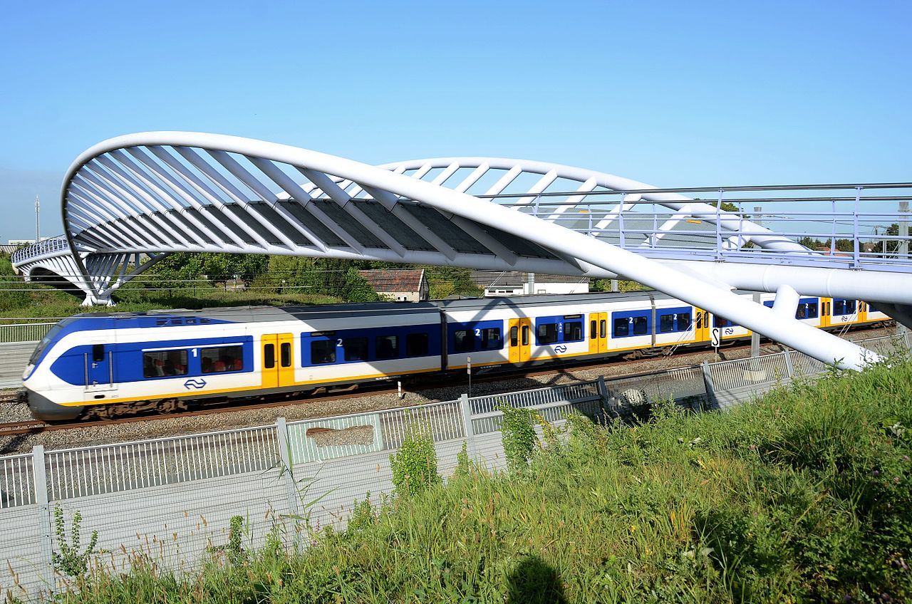 2. Een sprinter van het type SLT te Houten rijdt onder de voetgangers en fietsbrug. Datering: 4 september 2012.