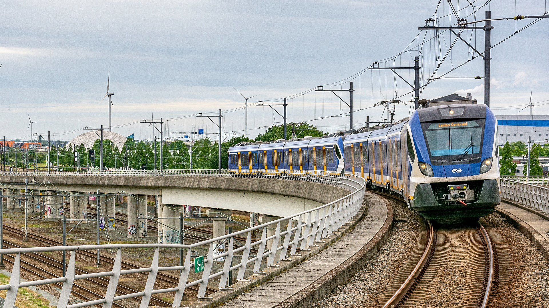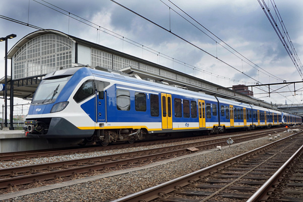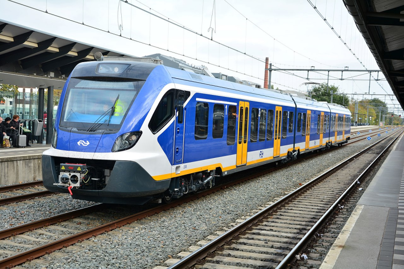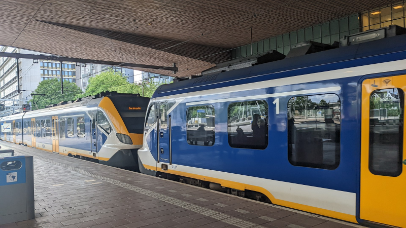 9. Twee SNG treinen van de Nederlandse Spoorwegen op station Haarlem met blauwe kop (boven) en Amsterdam Centraal met gele kop (beneden). Datering: 15 november 2021. Foto: Koplopermau - nl.wikipedia.org - Licentiestatus: CC BY-SA 4.0