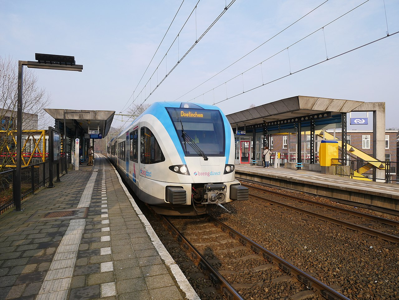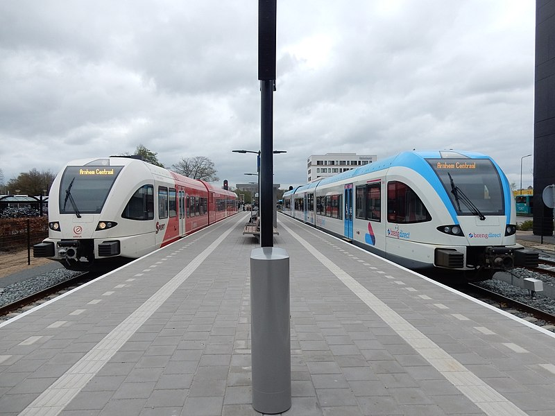 7. Een Breng-trein van het type Stadler GTW op station Arnhem Velperpoort in de Nederlandse provincie Gelderland.