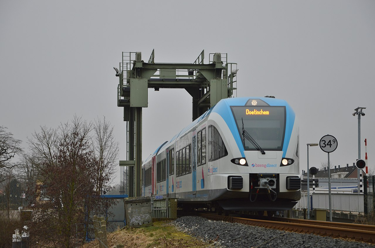 8. Een Breng-trein van het type Stadler GTW van Doetinchem naar Arnhem komt over de brug van de Oude IJssel.