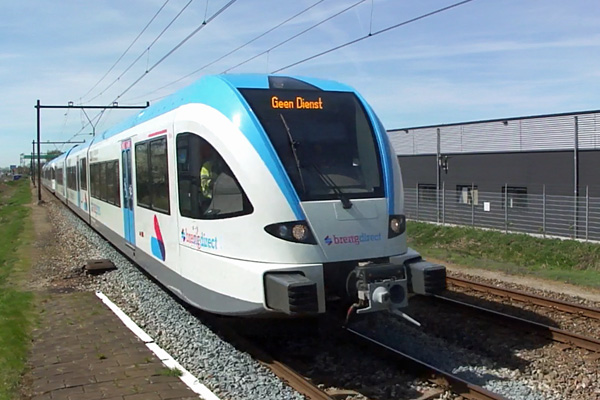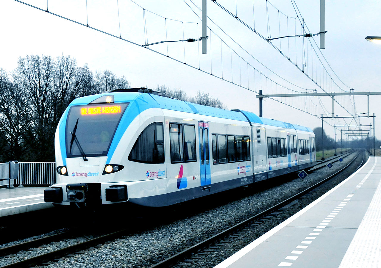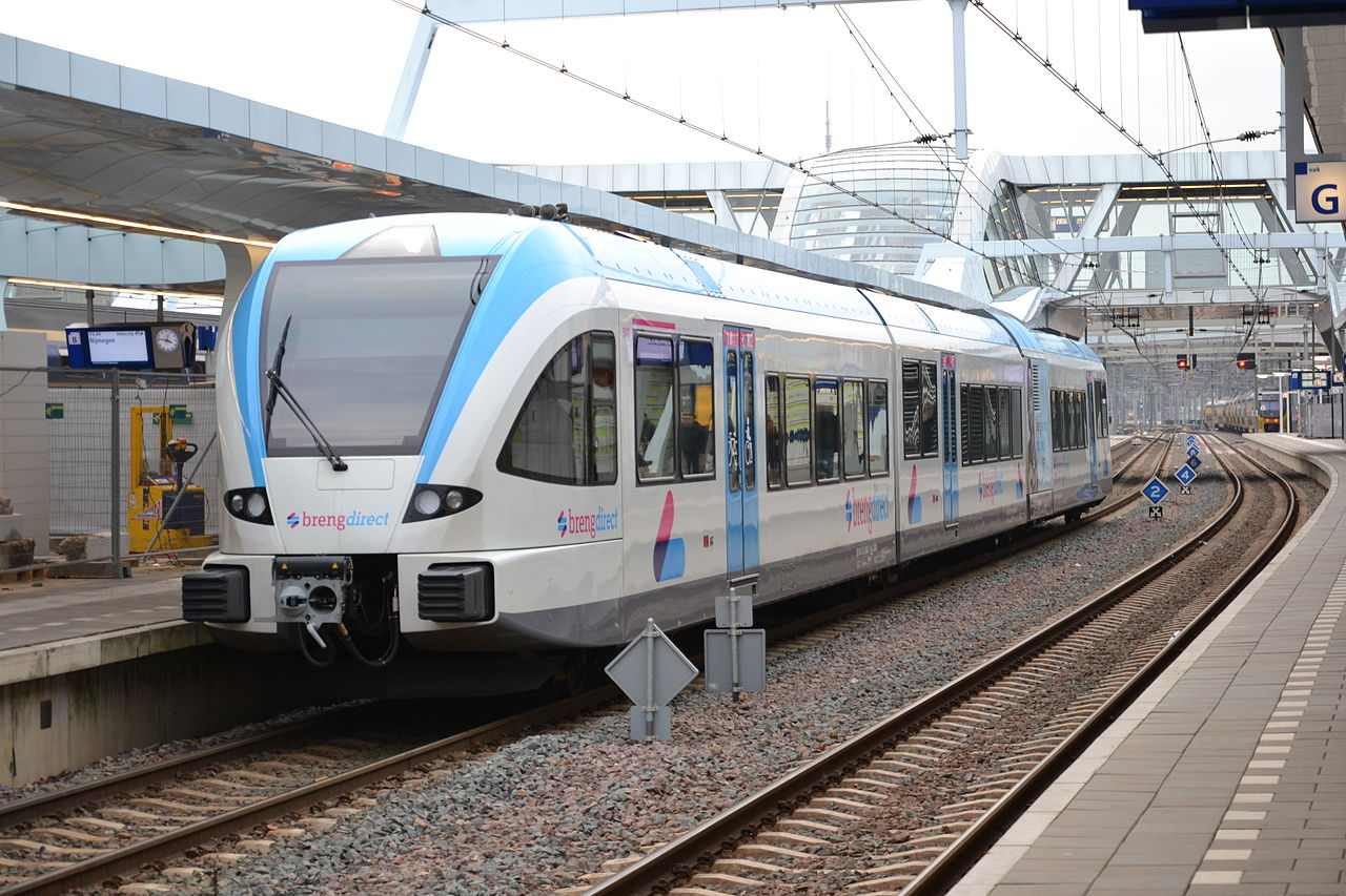 2. De GTW-treinen van Breng rijden als brengdirect. Breng GTW-treinstel 5048, na aankomst uit Doetinchem, op het station van Arnhem. Datering: 11november 2013. Foto: Alfenaar - nl.wikipedia.org - Licentiestatus: CC BY-SA 2.0
