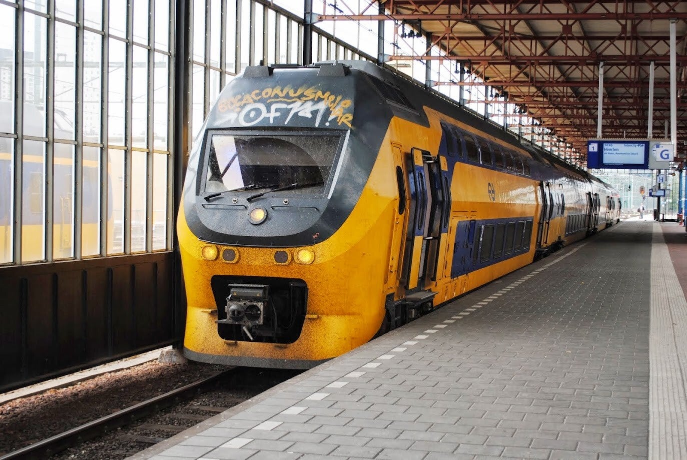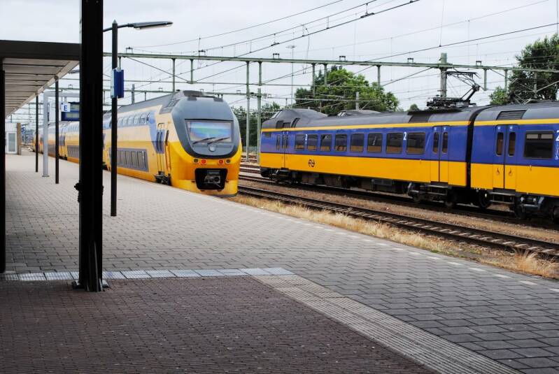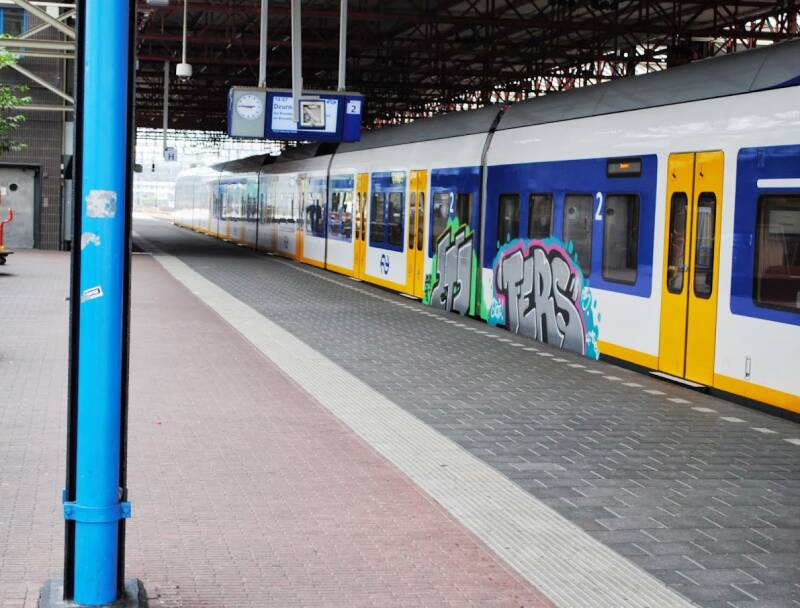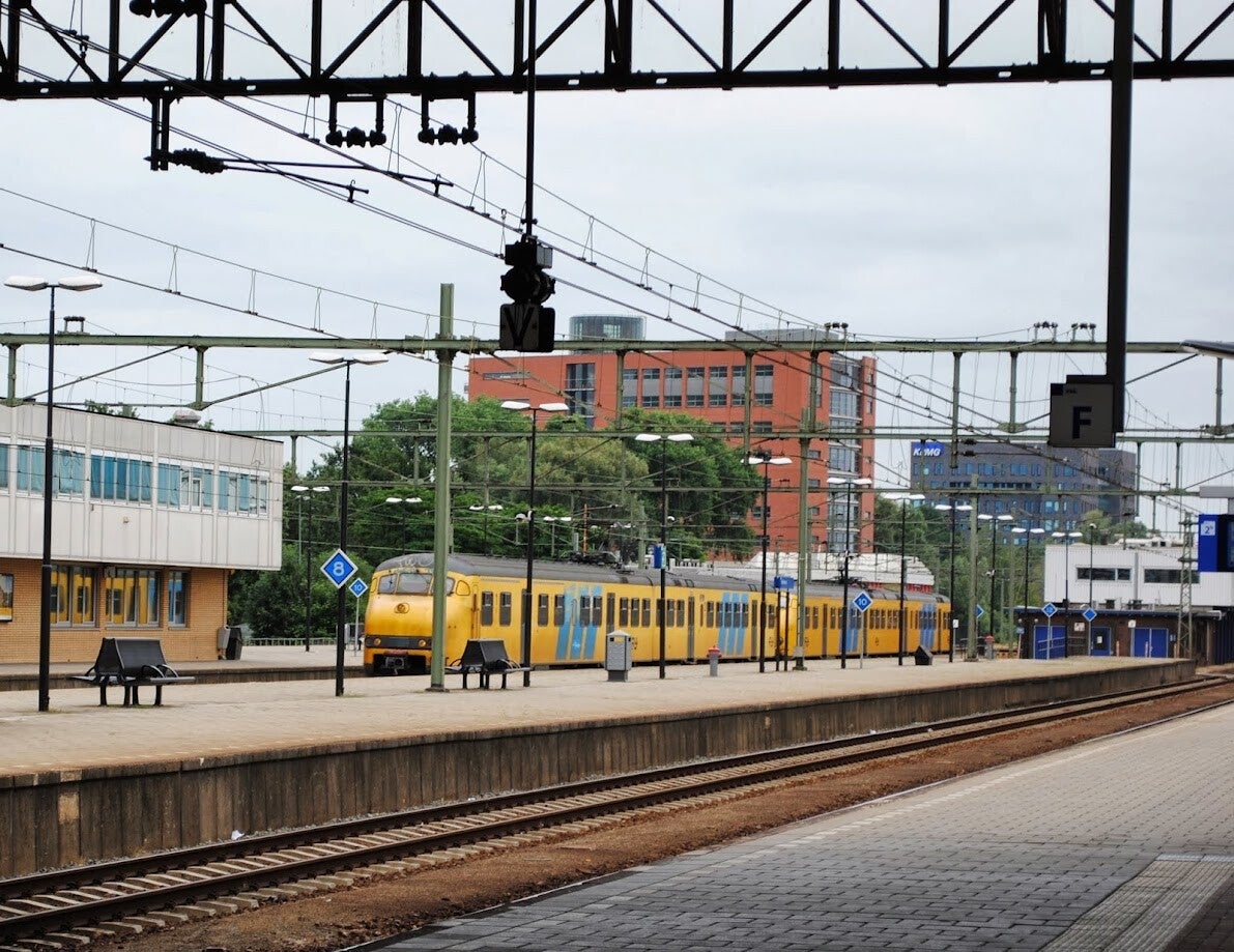 1.17. NS Station Eindhoven: Op spoor 3b nadert de sprinter Stadsgewestelijk Materieel (SGM) nr. 2976 naar Weert. Op spoor 2 nadert de intercitytrein ICR naar Venlo met het stuurstandrijtuig op kop. Datering: 20-07-2013. Foto: Eigen werk.