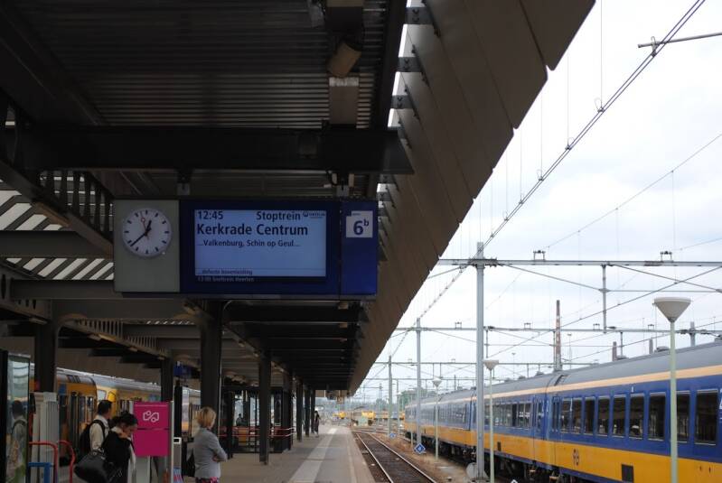 3.3. NS Station Maastricht met op het spoor naast spoor 6b een intercitytrein in afwachting van haar dienst. Op spoor 6b wordt verwacht de stoptrein naar Kerkrade Centrum van 12.45 uur. Datering: 08-06-2011. Foto: Eigen werk.