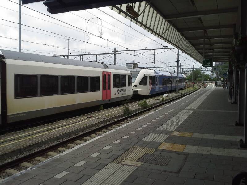 1.4. NS Station Venlo: Twee Arriva GTW treinstellen op het spoor naast het werkperron (niet zichtbaar). Een exemplaar in de Arriva kleurstelling. De andere nog in de Veolia kleurstelling. Datering: 07-06-2017. Foto: Leo Lambrechts - eigen werk.