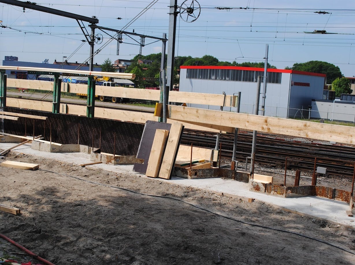 1.5. Spoorwegemplacement Venlo: Werkzaamheden nieuwe was- en reinigingsplaats voor treinen en geluidsscherm. Detail van de damwandconstructie. Datering: 27-05-2013. Foto: Eigen werk. Licentiestatus: Vrij herbruikbaar - Publiek Domein