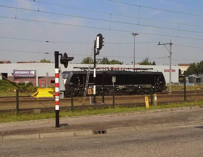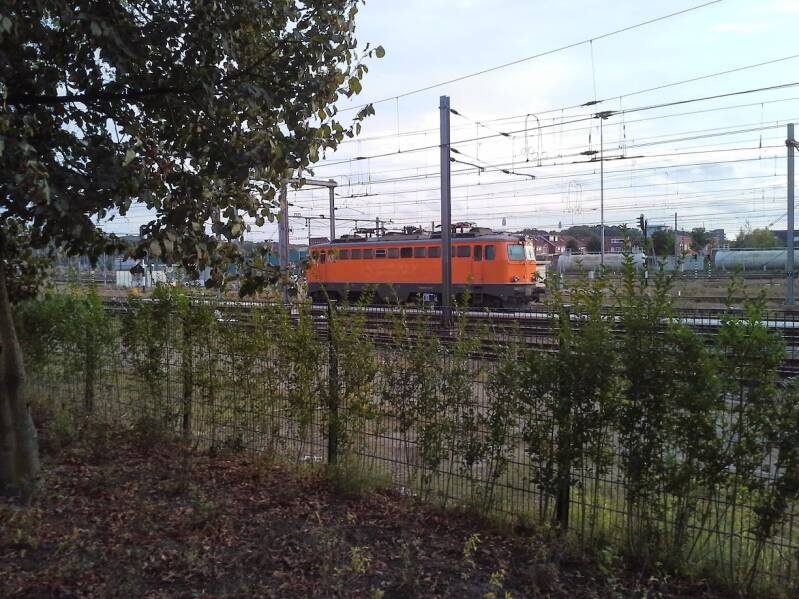 8.1. Spoorwegemplacement NS Venlo: Een electrische locomotief van een onbekend vervoerder gezien vanaf de Kaldenkerkerweg Venlo. Datering: 25-09-2014. Foto: Leo Lambrechts (eigen werk). Licentiestatus: Vrij herbruikbaar - Publiek domein