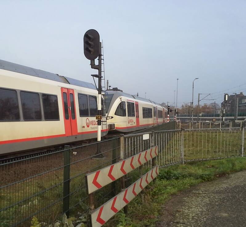 11.4. Spoorwegemplacement NS Venlo: Een Veolia Velios GTW treinstel 'Jack Poels' is de overweg Vier Paardjes bijna gepasseerd. De trein rijdt richting station Venlo en heeft eindbestemming Nijmegen. Datering: 20-11-2014. Foto: Leo Lambrechts (eigen werk).