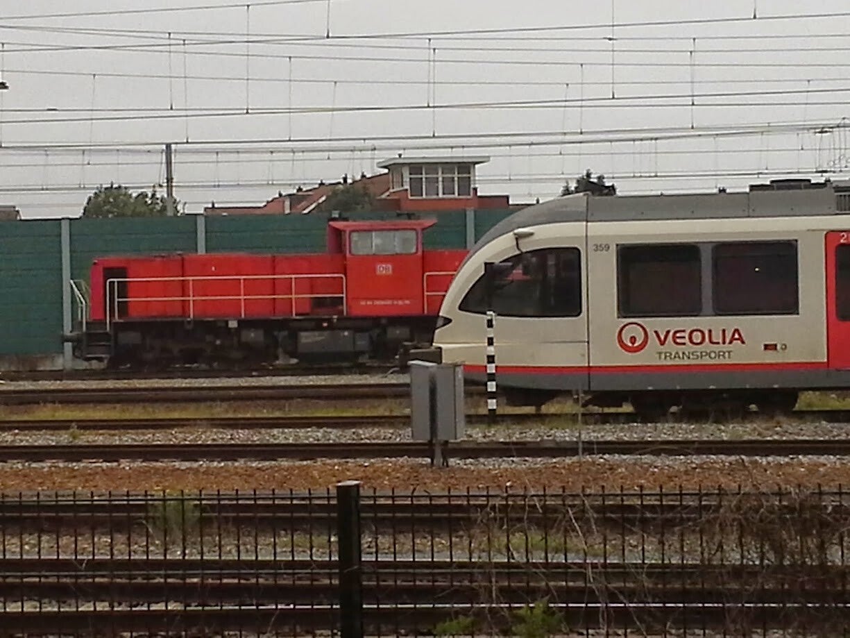 9.4. Spoorwegemplacement NS Venlo: Een Veolia Velios GTW diesel-electrisch treinstel nr. 354 staat opgesteld op het spoor naast het werkperron van NS station Venlo. Op de achtergrond zien we wagons voor autovervoer. Datering: 14-10-2014. Foto: Leo Lambrechts (eigen werk). Licentiestatus: Vrij herbruikbaar - Publiek domein