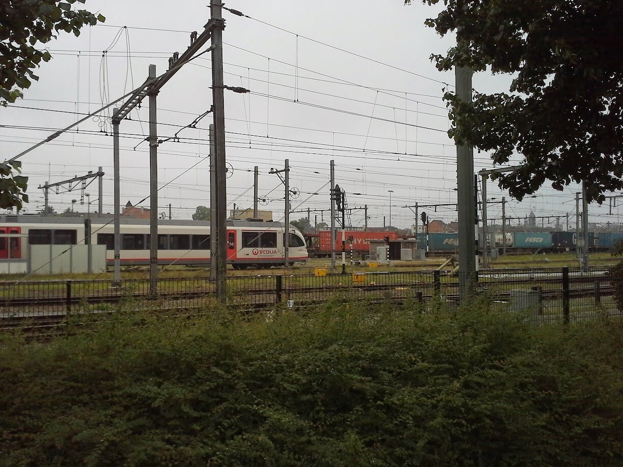 4.4. Spoorwegemplacement NS Venlo: Het emplacement gezien vanaf de Kaldenkerkerweg Venlo. Op de achtergrond zie we een Veolia Velios GTW diesel-electrisch treinstel 359 in afwachting van haar inzet. Datering: 14-07-2014. Foto: Eigen werk.