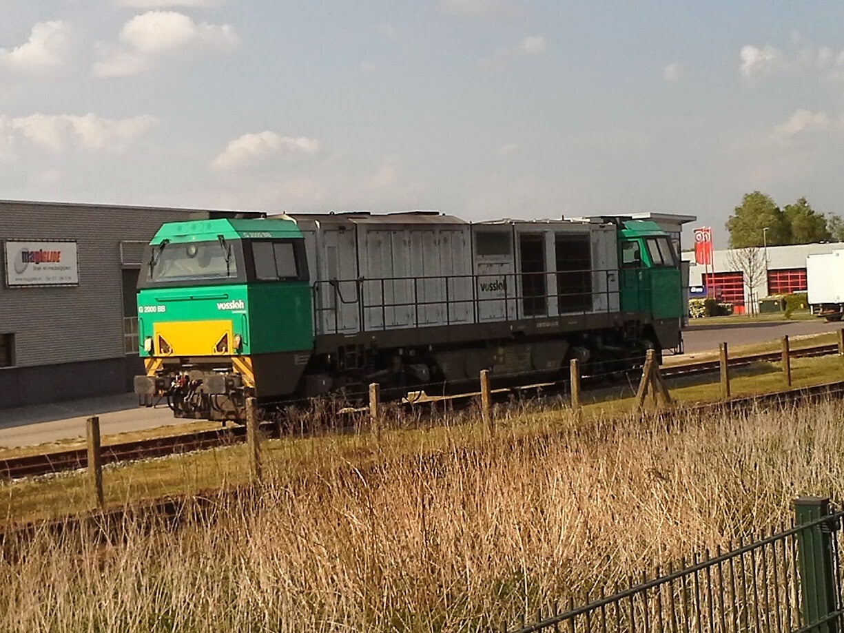 2.1. Spoorwegemplacement NS Venlo: Diesellocomotief G2000 - E8 van Vossloh op het opstelspoor voorbij de overweg Vier Paardjes Venlo. Datering: 20-04-2014. Foto: Eigen werk. Licentiestatus: Vrij herbruikbaar - Publiek Domein.