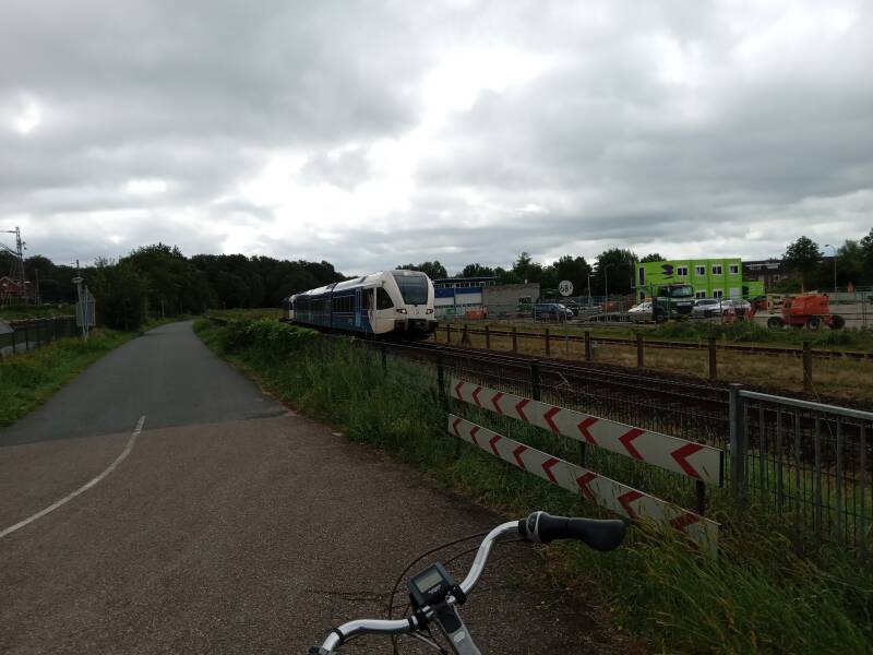 5.4. Spoorwegemplacement NS Venlo: Dubbel Arriva treinstel met o.a. voorop GTW 382 'Jan van Kuyk' nadert vanuit Tegelen het station van Venlo en passeert overweg Vierpaardjes. Rechts-achter is het emplacement van Venlo. Datering: 13-09-2023.