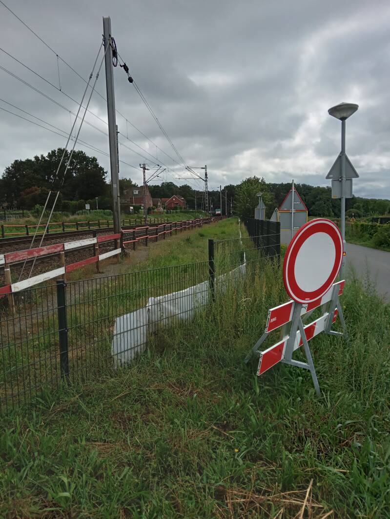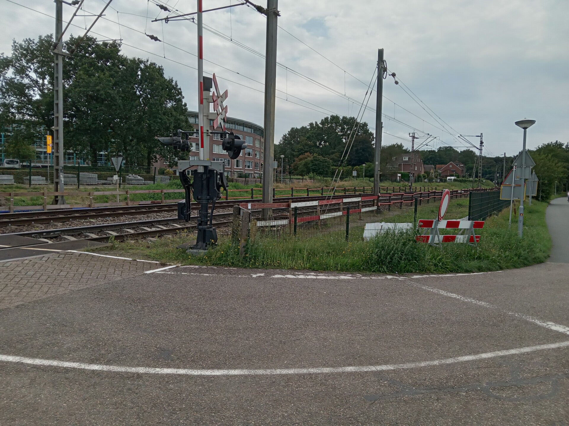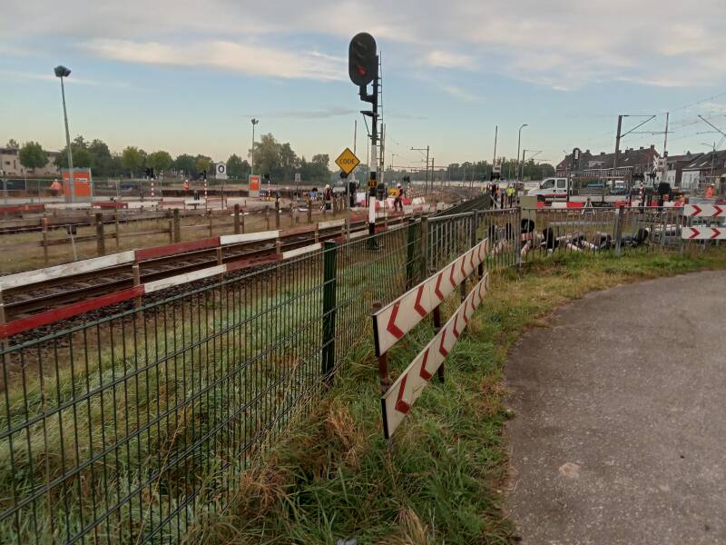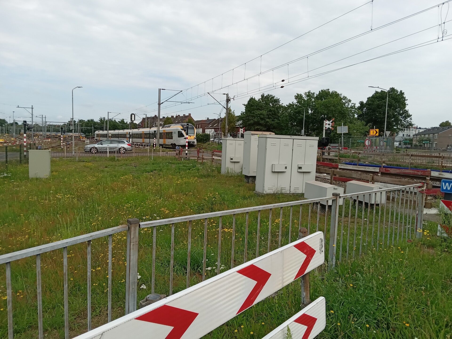 1.8. Spoorwegemplacement NS Venlo: Zicht op de overweg Vierpaardjes gezien vanaf de kleine overweg ver de sporen van en naar Duitsland. Duidelijk is te zien dat gestart is met de voorbereidende werkzaamheden i.v.m. de ondertunneling van de sporen ter hoogte van de Vier Paardjes. Datering: 16-08-2023. Foto: Leo Lambrechts (eigen werk).