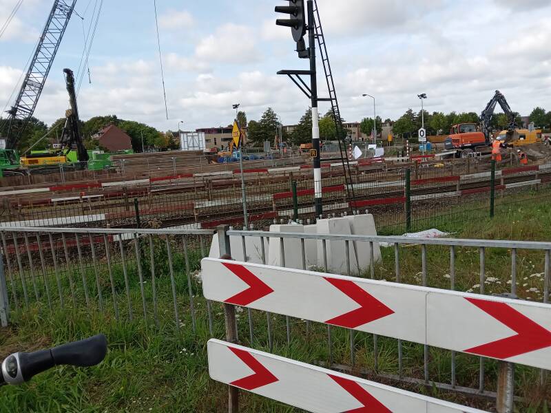 4.3. Spoorwegemplacement NS Venlo: Werkzaamheden t.b.v. onderdoorgang Vierpaardjes. Het bouwterrein aan de westkant van de huidige sporen. Datering: 13-09-2023. Foto: Leo Lambrechts (eigen werk). Licentiestatus: Vrij herbruikbaar - Publiek Domein