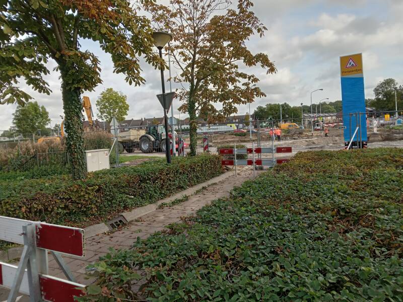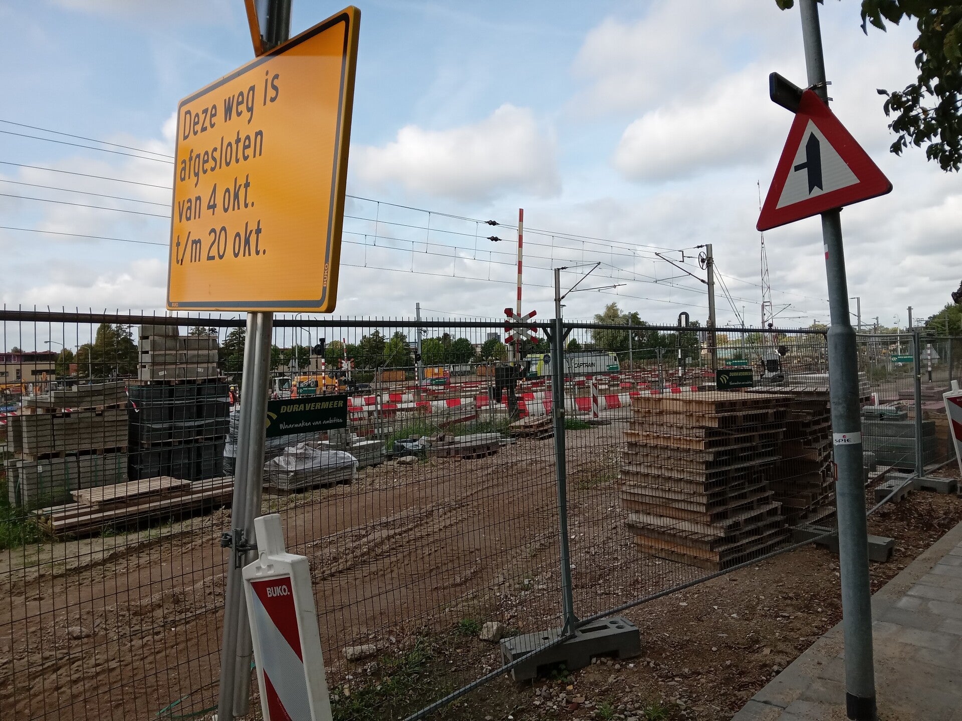6.3. Spoorwegemplacement NS Venlo: Werkzaamheden t.b.v. onderdoorgang Vierpaardjes. Het bouwterrein aan de oostkant van de huidige sporen. Aansluitende wegen zijn al gedeeltelijk aangelegd en in gebruik. Op het gele bord staat vermeld: Deze weg is afgesloten van 4 okt. t/m 20 okt. Datering: 05-10-2023.