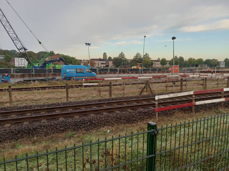6.8. Spoorwegemplacement NS Venlo: Werkzaamheden t.b.v. onderdoorgang Vierpaardjes. Het bouwterrein aan de westkant van de huidige sporen, gezien vanaf de Broekestraat Venlo. Datering: 05-10-2023.