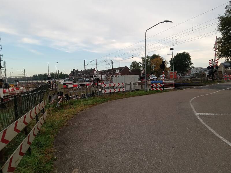 7.16. Spoorwegemplacement NS Venlo: Werkzaamheden t.b.v. onderdoorgang Vierpaardjes. Het bouwterrein aan de oostkant van de huidige sporen, met zicht op de tijdelijke (oude) overweg Vierpaardjes Venlo.