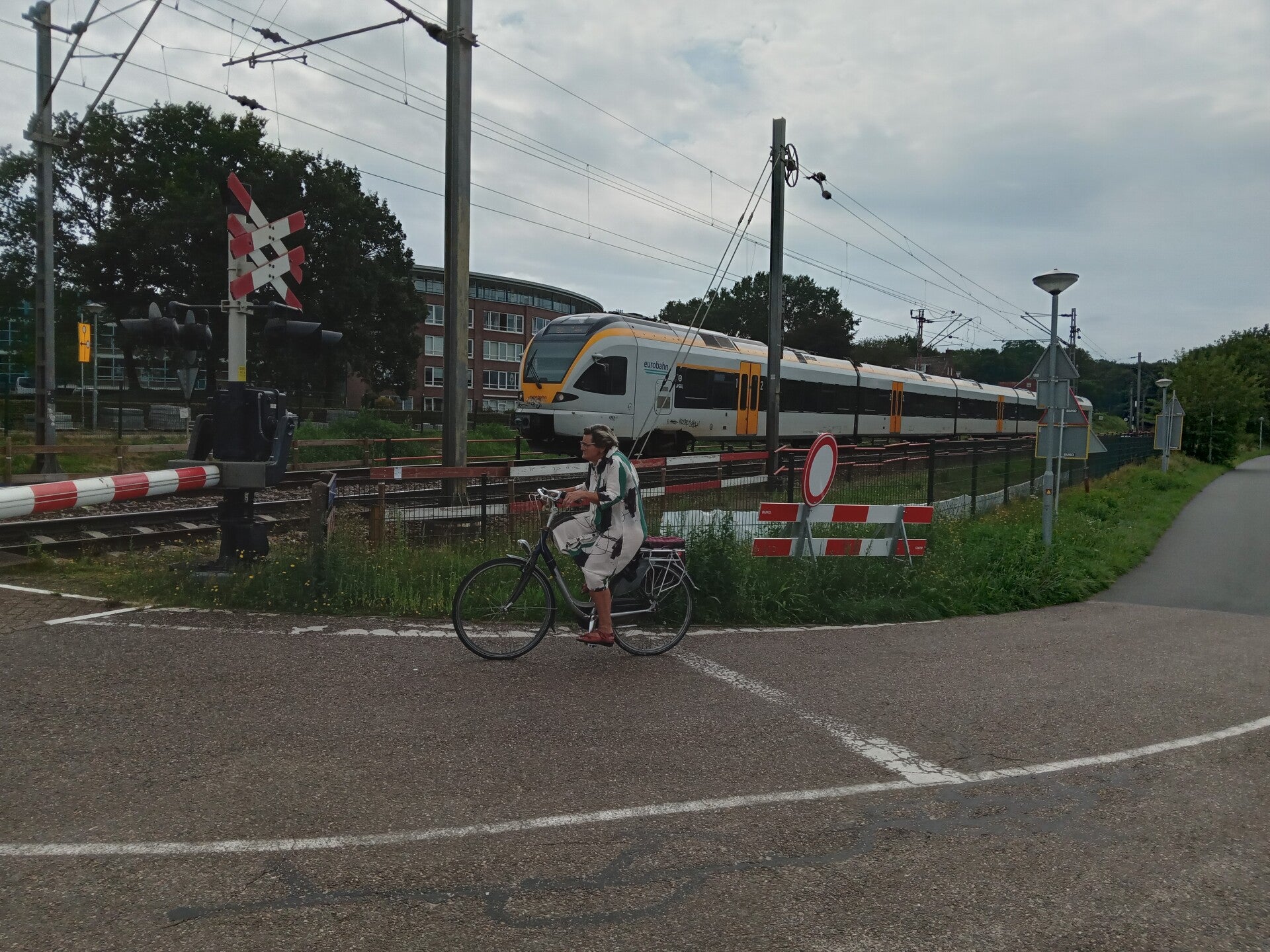 1.4. Spoorwegemplacement NS Venlo: Een internationale trein uit Duitsland van Eurobahn nadert station Venlo. Deze passeert zojuist de overweg Vier paardjes Venlo. Datering: 16-08-2023. Foto: Leo Lambrechts (eigen werk).