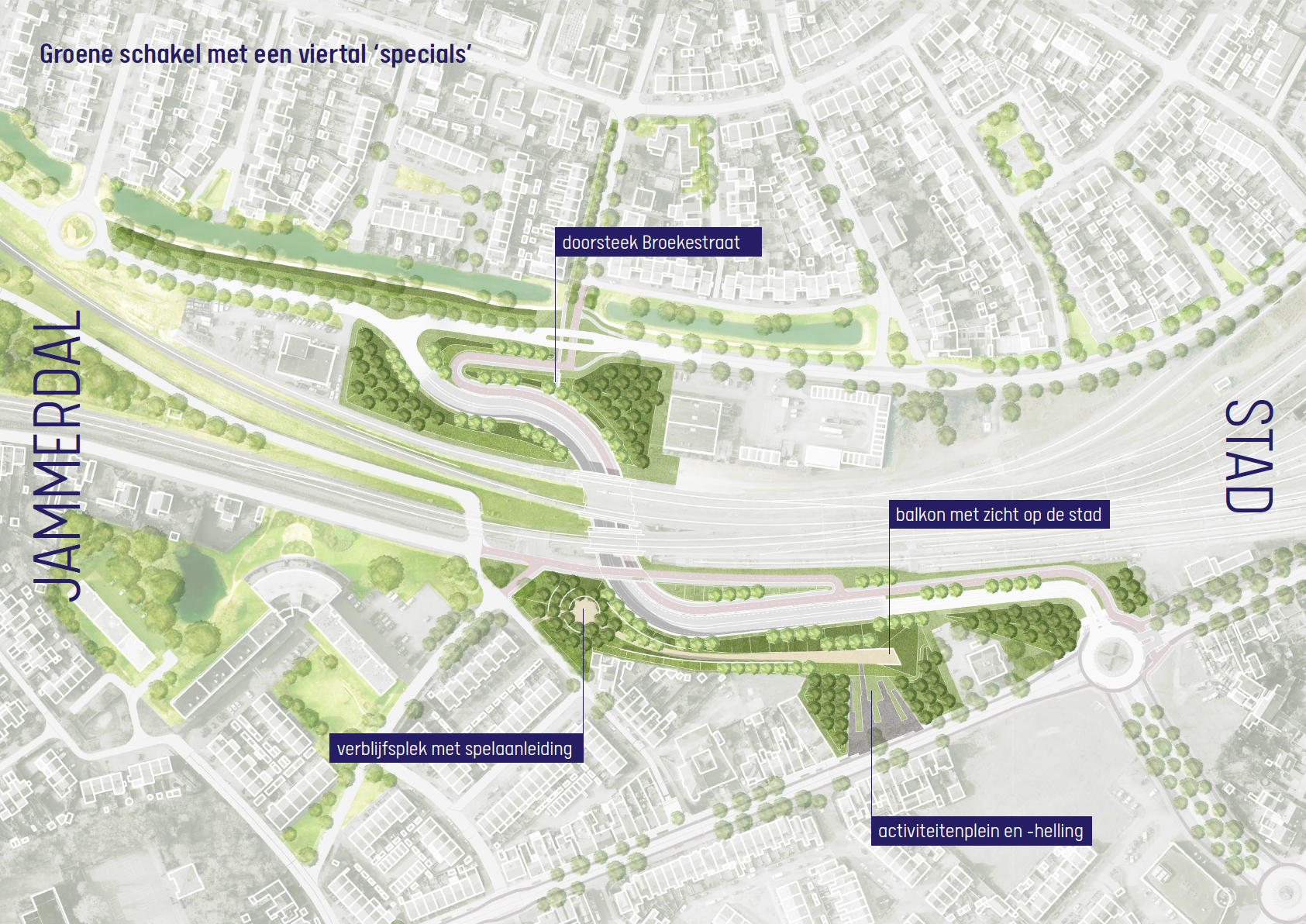 3.1. Op deze schets staat het bovenaanzicht van Vierpaardjes waar de groene schakel naar het Joamerdal duidelijk wordt. Ook staan de herkenbare elementen (specials) zoals de doorsteek Broekestraat, de verblijfsplek met speelaanduiding, het activiteitenplein en de activiteitenhelling en het balkon met zicht op de stad aangeduid.