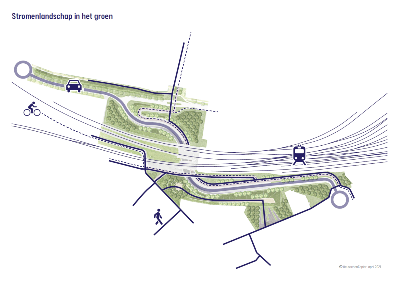 3.2. Op deze tekening wordt aangegeven hoe de wegen, fiets- en voetpaden en het spoor bijdragen aan het uitbeelden van een stroomlandschap verpakt in groen. Bron: vierpaardjesvenlo.nl/projectinformatie/schetsontwerpen-onderdoorgang-vierpaardjes